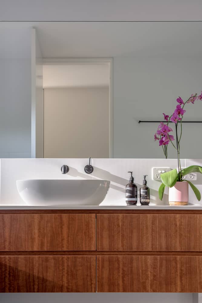 Ванная комната отделана деревом того же оттенка, что и внешний фасад, создавая ощущение непрерывности пространства. Это делает интерьер цельным и спокойным.