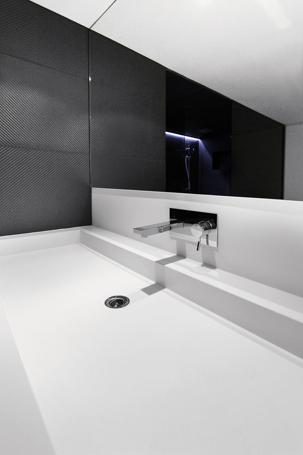 Дизайнеры остались верны чёрно-белому стилю в отделке и этой части особняка. Ослепляющая своей красотой необычная ванна прекрасно сочетается с тёмным блоком туалетной комнаты.
