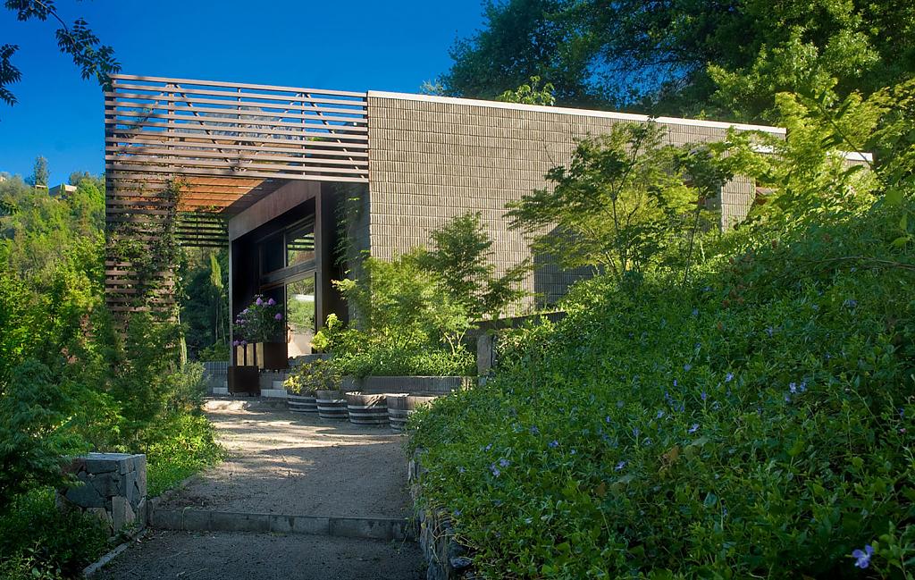 Особняк можно условно поделить на две части: первая – это мастерская, кухня-столовая, спальня и сауна, вторая – большая площадка для барбекю, бассейн, ванная комната, подвал. Эти помещения находятся на разных уровнях, но соединены множеством переходов, что делает перемещение между покоями очень удобным. В оформлении преимущественно использовался металл, поэтому жилище выглядит модным и стильным.