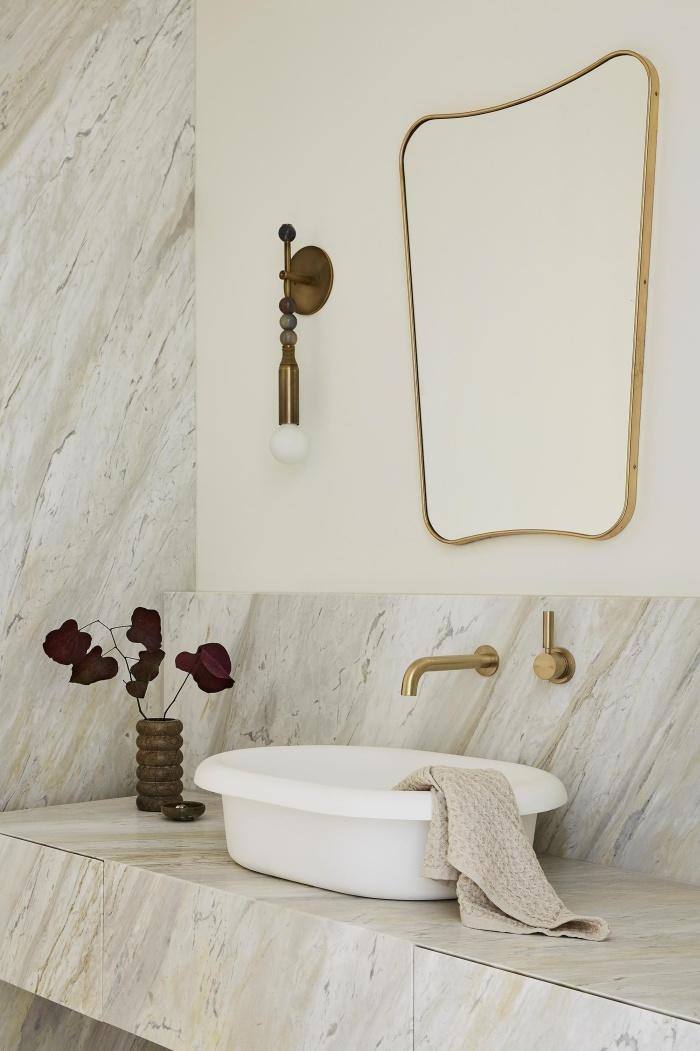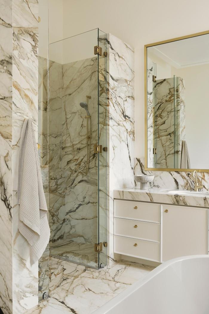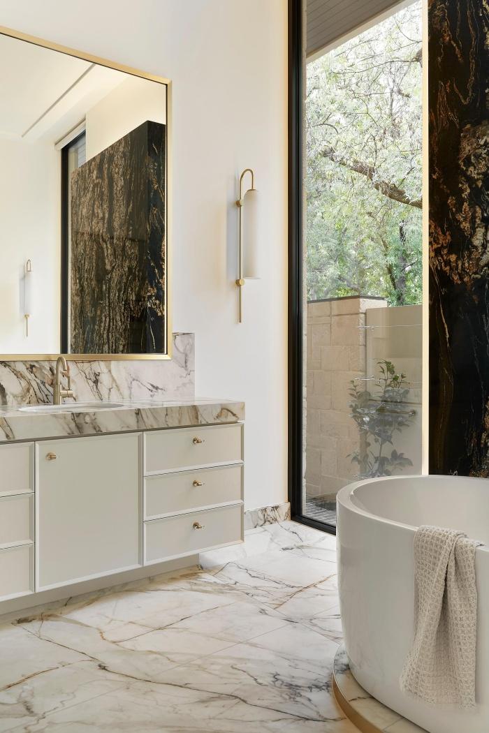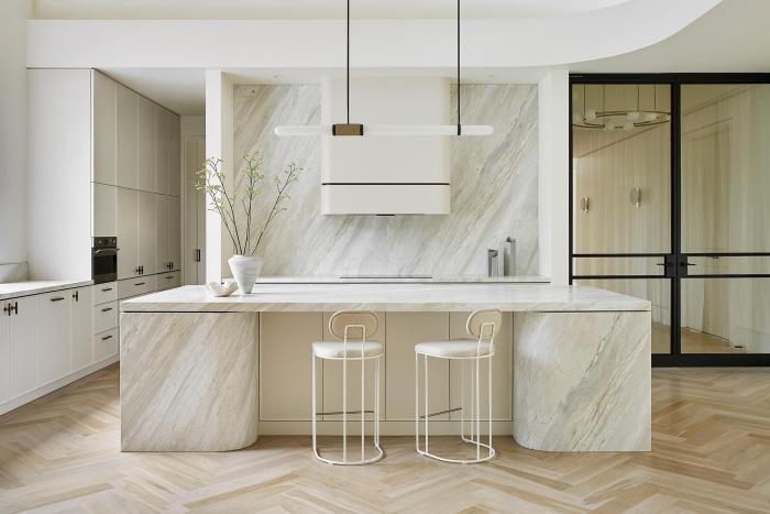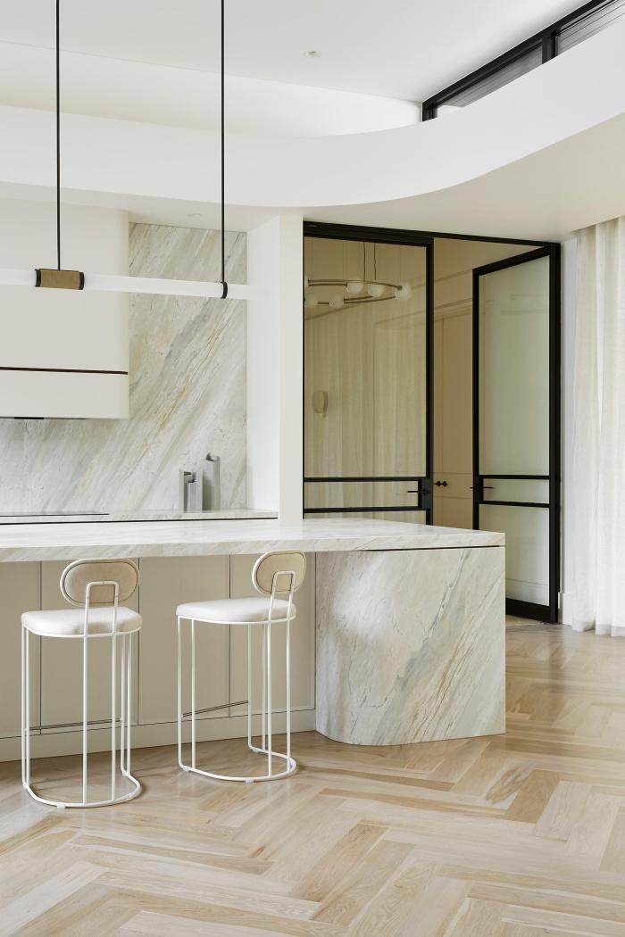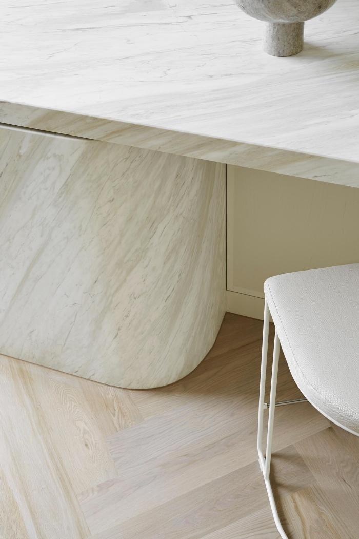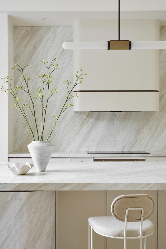 Мрамор с его мягкими, естественными прожилками стал ключевым материалом – он не только добавлял роскоши и текстуры, но и визуально связывал современные и традиционные элементы, отражая природную эстетику.