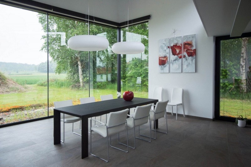 Требование низких энергетических затрат — это ключевой фактор в стадии планирования дизайна. Все необходимые подключения (выключатели, розетки) размещены низко на стене или на полу. Освещение пространства осуществляется через люк в крыше над садом, большие окна от пола до потолка в зоне гостиной. Из них открывается прекрасный вид на поля.
